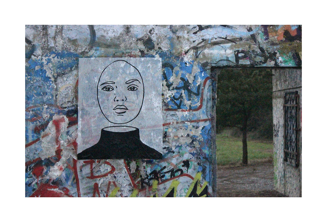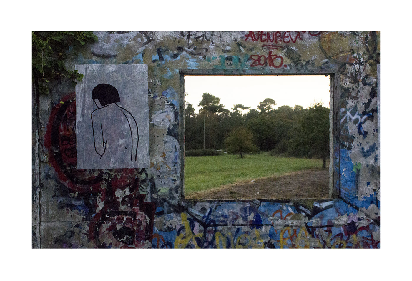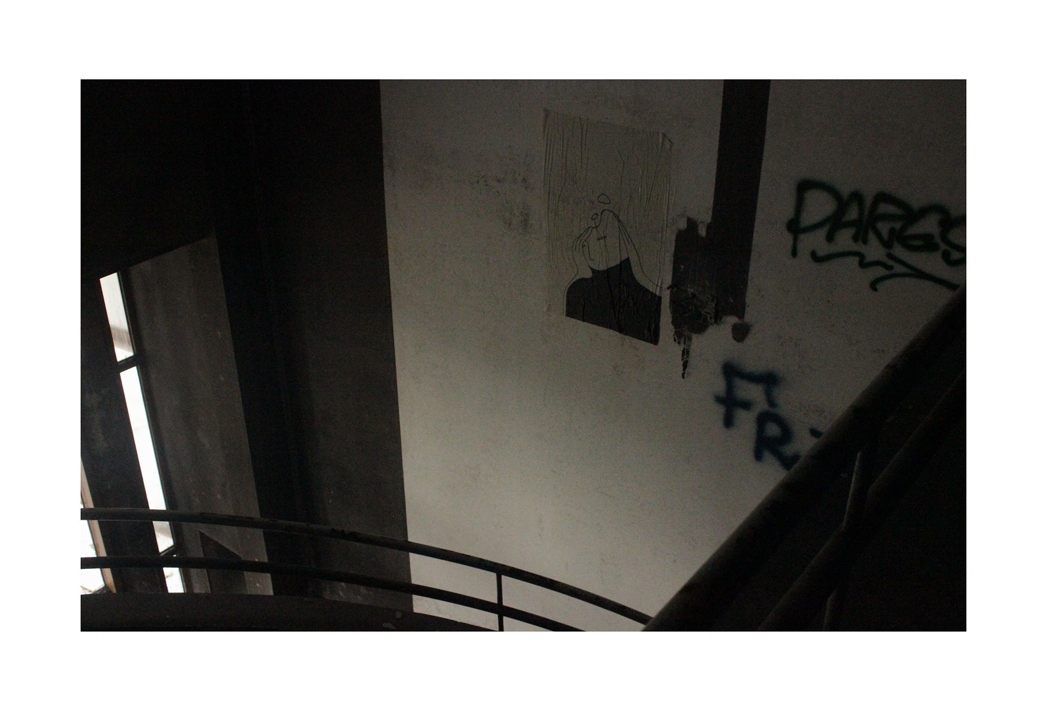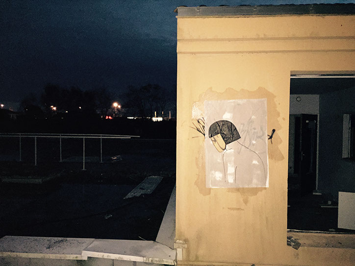 Ici, la technique du collage permet non seulement de prendre possession d’un lieu mais aussi au dessin de dépasser le cadre de la simple feuille de papier et d’acquérir une dimension matérielle.